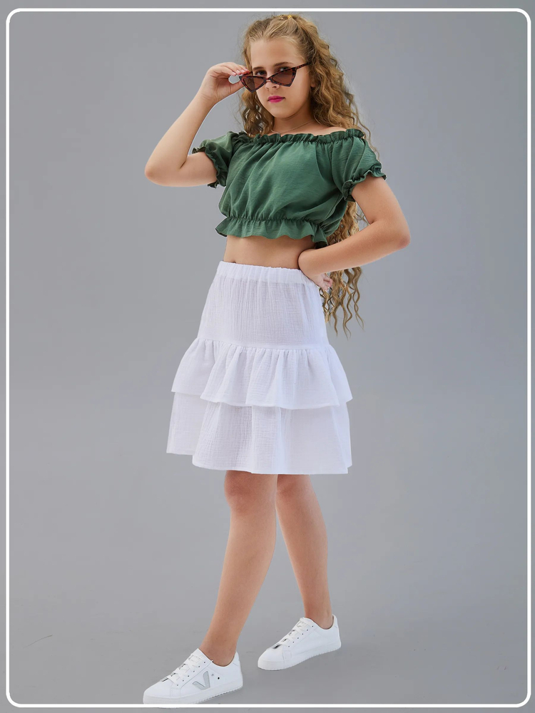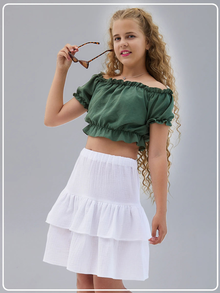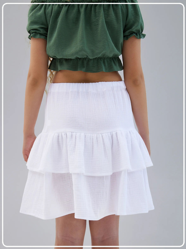 Данная модель имеет ярусный дизайн, который украшен изящными воланами, придающими юбке особую легкость и игривость. С её свободным кроем и длиной миди — слегка выше колена с эффектными воланами,юбка смотрится очень стильно и современно. Она подходит на любую фигуру, подчеркивая красоту и индивидуальность вашей юной модницы.