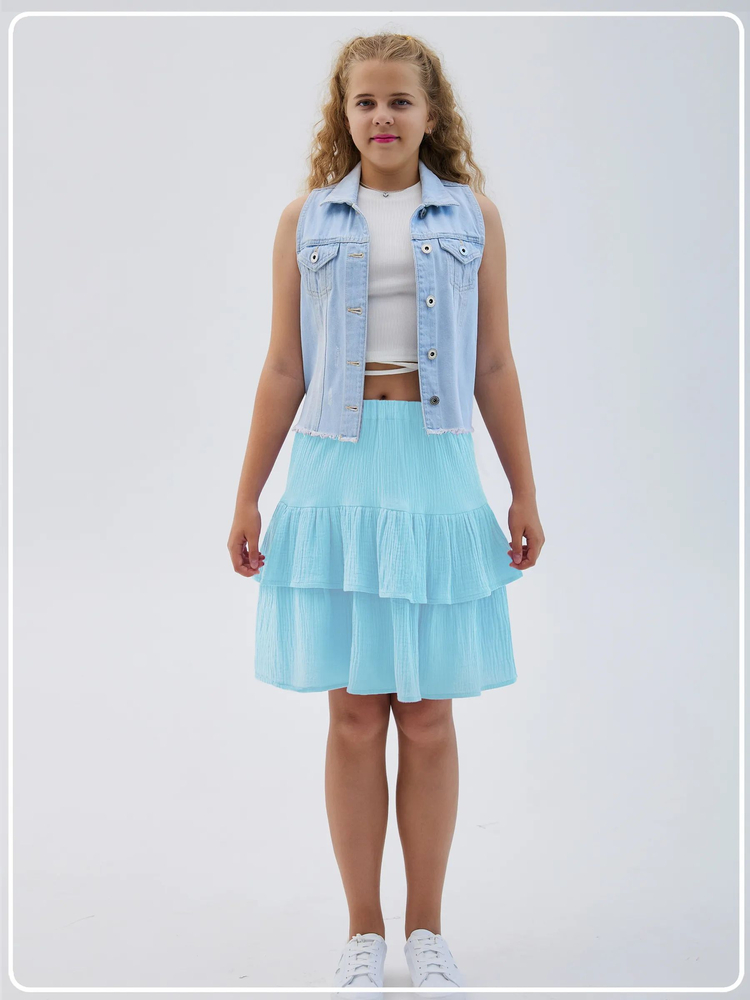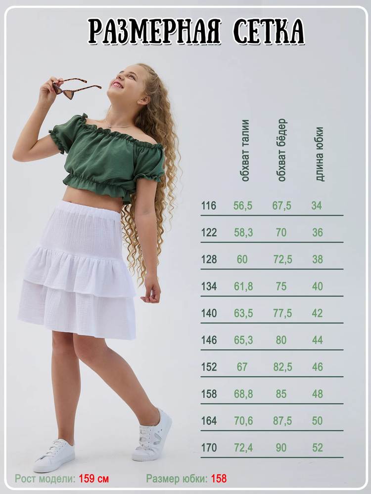 Данная модель имеет ярусный дизайн, который украшен изящными воланами, придающими юбке особую легкость и игривость. С её свободным кроем и длиной миди — слегка выше колена с эффектными воланами,юбка смотрится очень стильно и современно. Она подходит на любую фигуру, подчеркивая красоту и индивидуальность вашей юной модницы.